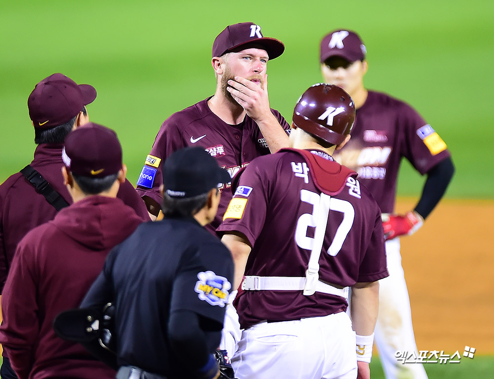[엑스포츠뉴스 잠실, 김한준 기자] 22일 오후 서울 송파구 잠실야구장에서 열린 '2019 신한은행 MY CAR KBO 포스트시즌' 키움 히어로즈와 두산 베어스의 한국시리즈 1차전 경기, 4회말 2사 1루 두산 박건우의 도루 상황에서 키움 선발투수 요키시가 박동원의 송구에 얼굴을 맞은 후 고통을 호소하고 있다.