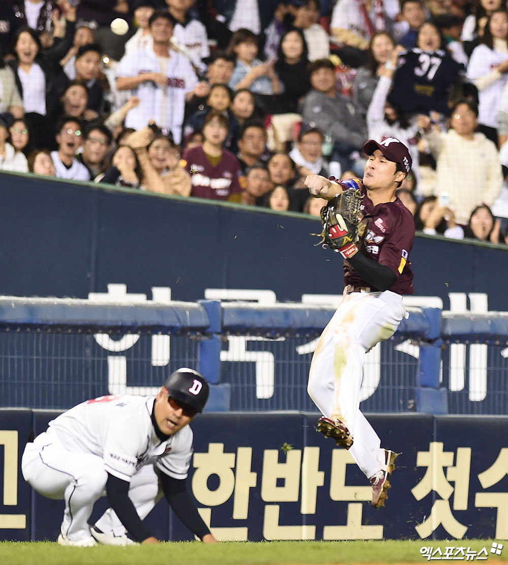 [엑스포츠뉴스 잠실, 박지영 기자] 22일 오후 서울 송파구 잠실야구장에서 열린 '2019 신한은행 MY CAR KBO 포스트시즌' 키움 히어로즈와 두산 베어스의 한국시리즈 1차전 경기, 4회말 2사 2루 두산 박건우의 내야땅볼 때 키움 3루수 김웅빈의 실책이 나오며 두산 2루주자 김재호가 홈으로 쇄도하자 키움 유격수 김하성이 타구를 홈으로 송구하고 있다.