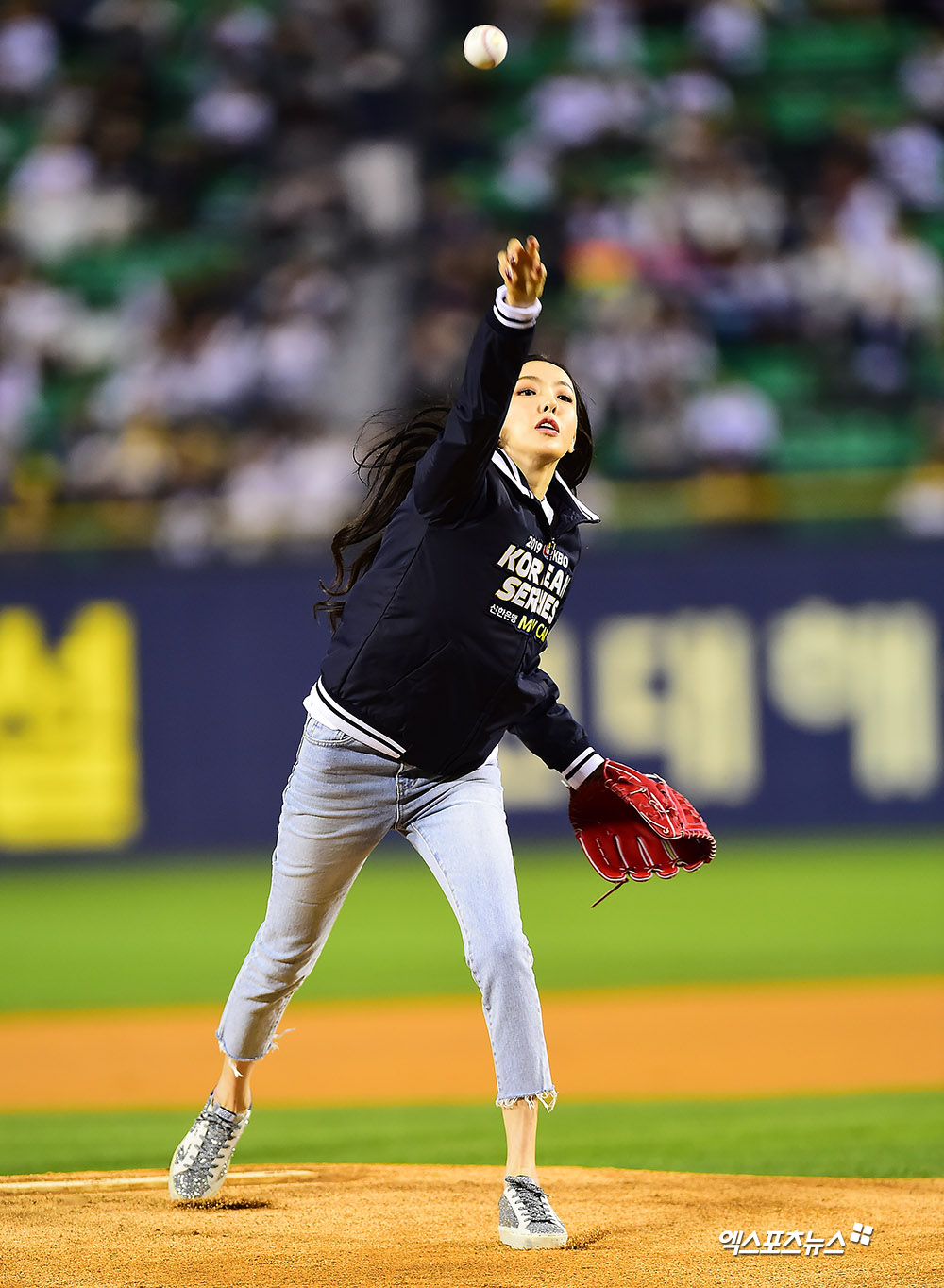 [엑스포츠뉴스 잠실, 김한준 기자] 23일 오후 서울 송파구 잠실야구장에서 열린 '2019 신한은행 MY CAR KBO 포스트시즌' 키움 히어로즈와 두산 베어스의 한국시리즈 2차전 경기, 경기 전 이다희가 시구에 임하고 있다.