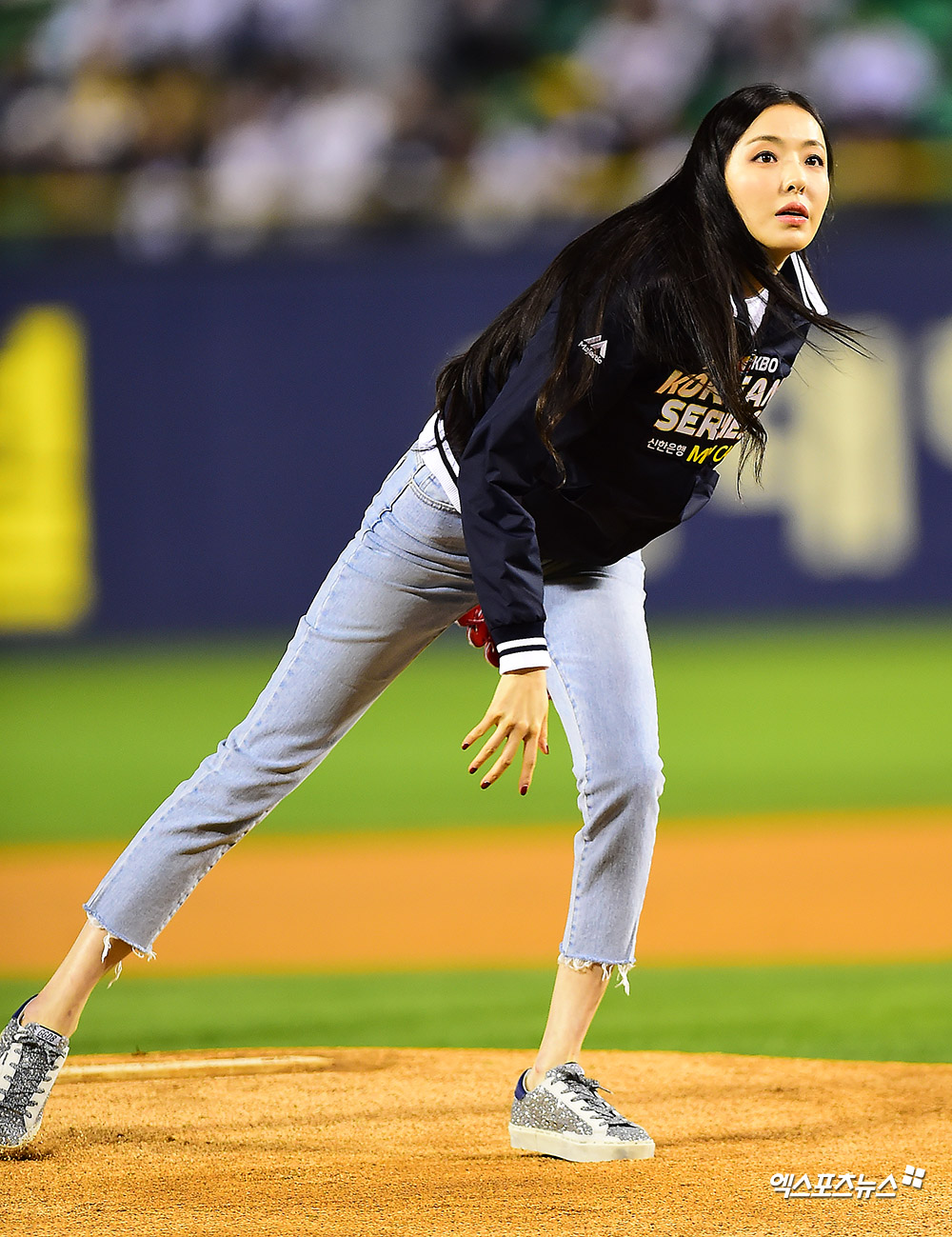 [엑스포츠뉴스 잠실, 김한준 기자] 23일 오후 서울 송파구 잠실야구장에서 열린 '2019 신한은행 MY CAR KBO 포스트시즌' 키움 히어로즈와 두산 베어스의 한국시리즈 2차전 경기, 경기 전 배우 이다희가 시구에 임하고 있다.
