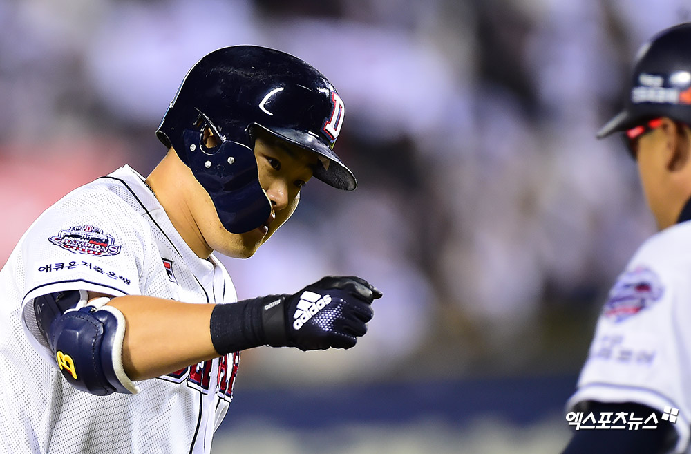 [엑스포츠뉴스 잠실, 김한준 기자] 23일 오후 서울 송파구 잠실야구장에서 열린 '2019 신한은행 MY CAR KBO 포스트시즌' 키움 히어로즈와 두산 베어스의 한국시리즈 2차전 경기, 4회말 2사 1루 두산 오재일이 투런 홈런을 날린 후 하이파이브를 하고 있다.