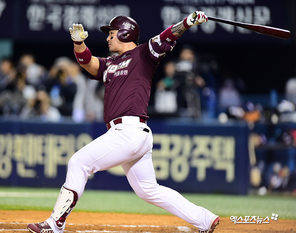[엑스포츠뉴스 잠실, 김한준 기자] 23일 오후 서울 송파구 잠실야구장에서 열린 '2019 신한은행 MY CAR KBO 포스트시즌' 키움 히어로즈와 두산 베어스의 한국시리즈 2차전 경기, 6회초 1사 1루 키움 박병호가 1타점 2루타를 날리고 있다.