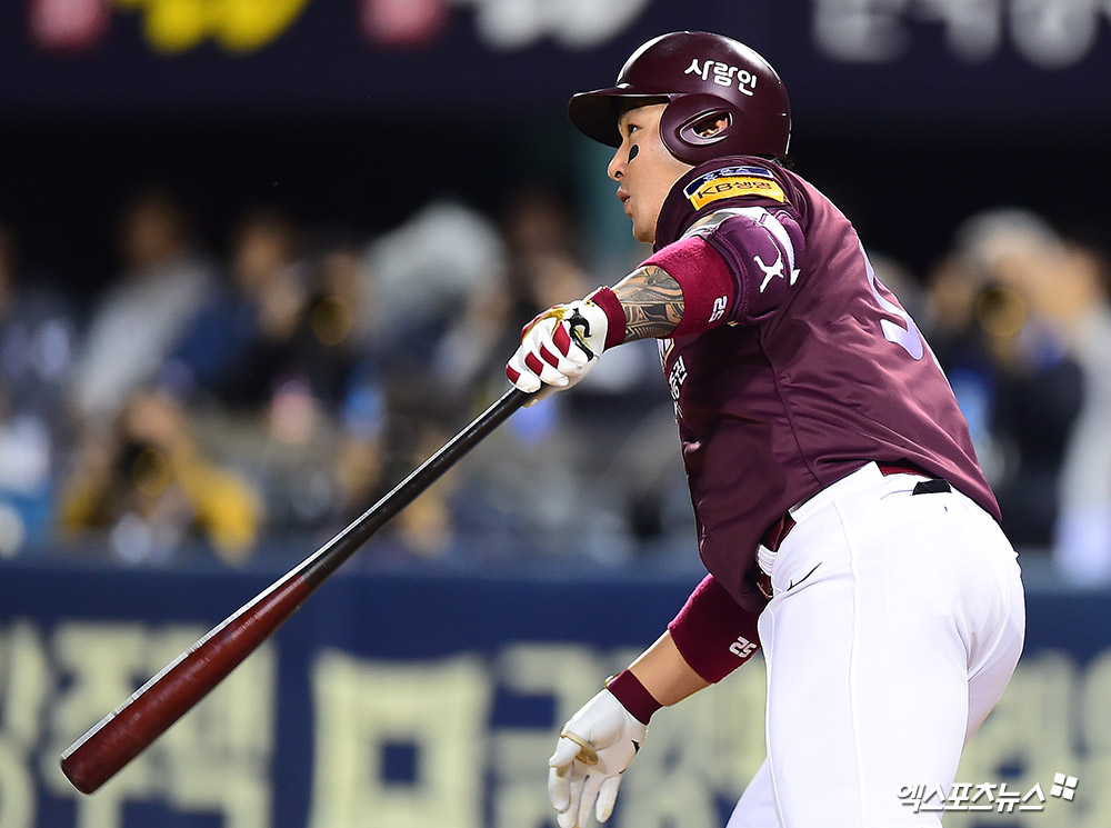 [엑스포츠뉴스 잠실, 김한준 기자] 23일 오후 서울 송파구 잠실야구장에서 열린 '2019 신한은행 MY CAR KBO 포스트시즌' 키움 히어로즈와 두산 베어스의 한국시리즈 2차전 경기, 6회초 1사 1루 키움 박병호가 1타점 2루타를 날리고 있다.