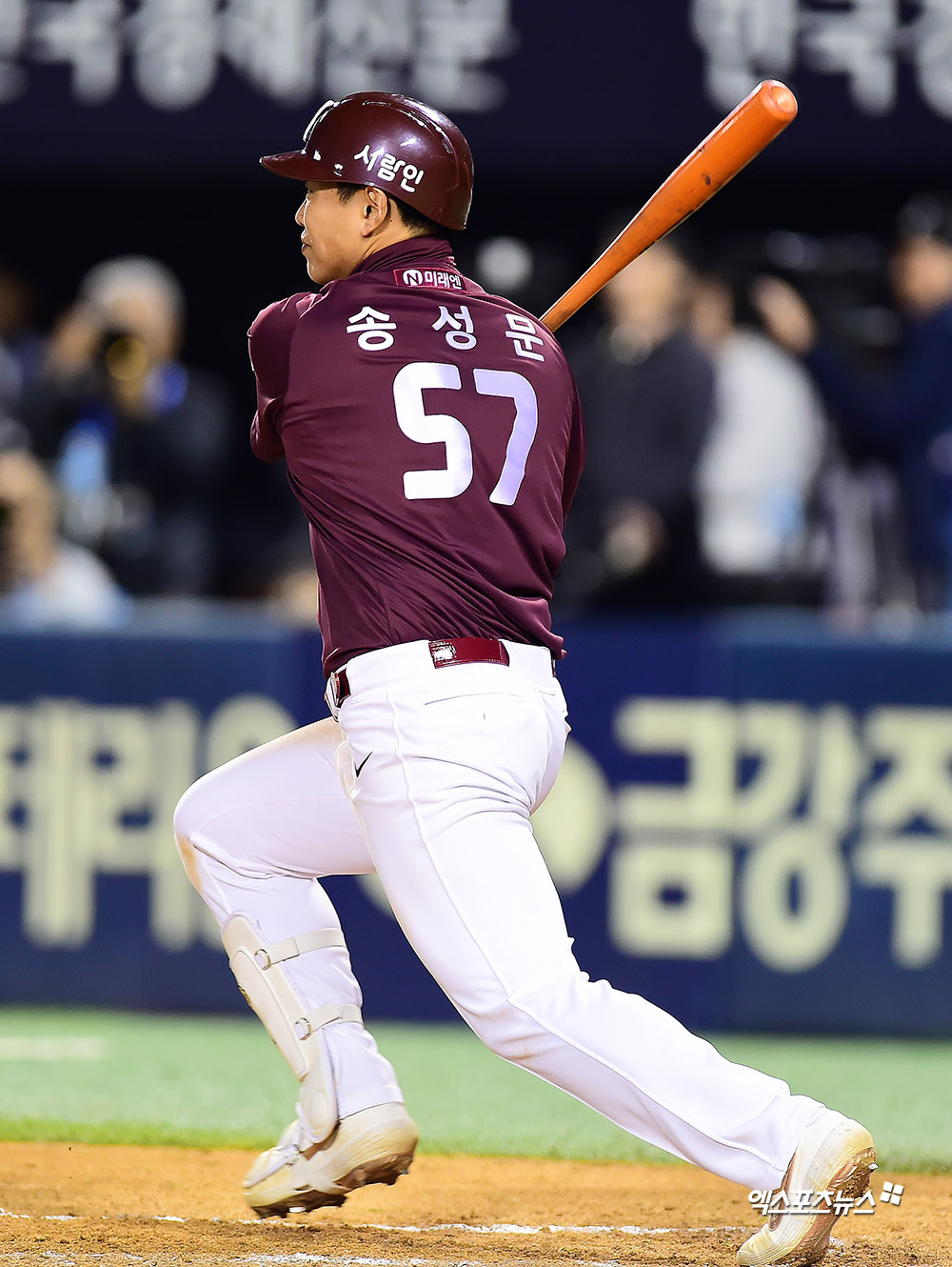 [엑스포츠뉴스 잠실, 김한준 기자] 23일 오후 서울 송파구 잠실야구장에서 열린 '2019 신한은행 MY CAR KBO 포스트시즌' 키움 히어로즈와 두산 베어스의 한국시리즈 2차전 경기, 6회초 1사 1,2루 키움 송성문이 1타점 적시타를 날리고 있다.
