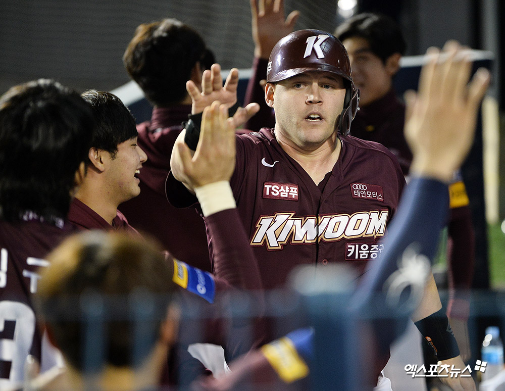 [엑스포츠뉴스 잠실, 김한준 기자] 23일 오후 서울 송파구 잠실야구장에서 열린 '2019 신한은행 MY CAR KBO 포스트시즌' 키움 히어로즈와 두산 베어스의 한국시리즈 2차전 경기, 6회초 1사 1루 키움 샌즈가 박병호의 1타점 2루타때 득점에 성공한 후 더그아웃에서 하이파이브를 하고 있다.