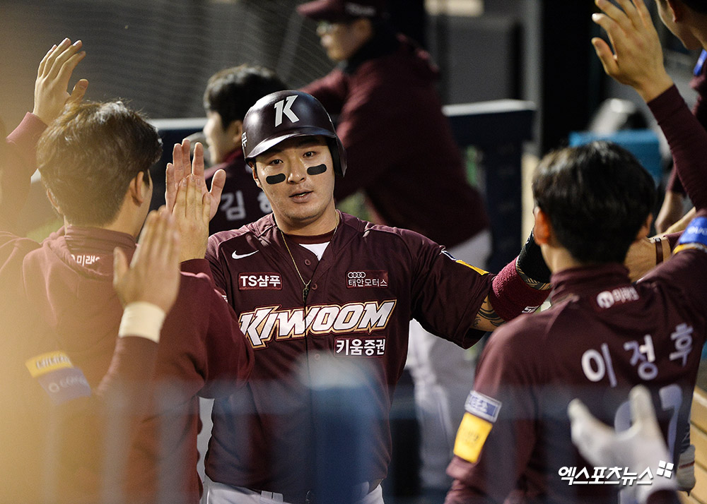 [엑스포츠뉴스 잠실, 김한준 기자] 23일 오후 서울 송파구 잠실야구장에서 열린 '2019 신한은행 MY CAR KBO 포스트시즌' 키움 히어로즈와 두산 베어스의 한국시리즈 2차전 경기, 6회초 1사 1,2루 키움 박병호가 송성문의 1타점 적시타때 득점에 성공한 후 더그아웃에서 하이파이브를 하고 있다.
