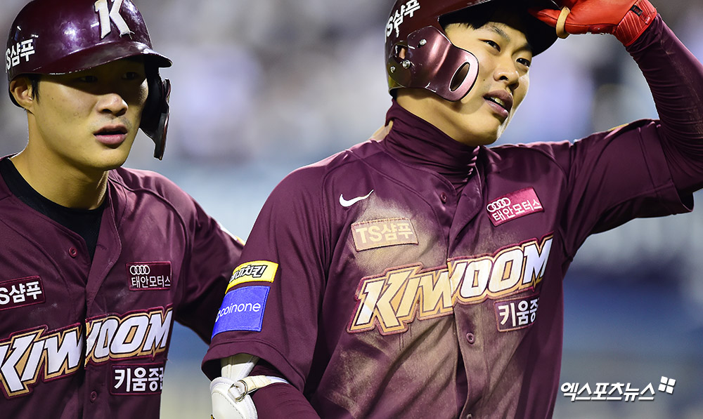 8회초 무사 1루 키움 송성문이 번트를 시도했지만 병살타 아웃된 후 김하성의 위로를 받고 있다.