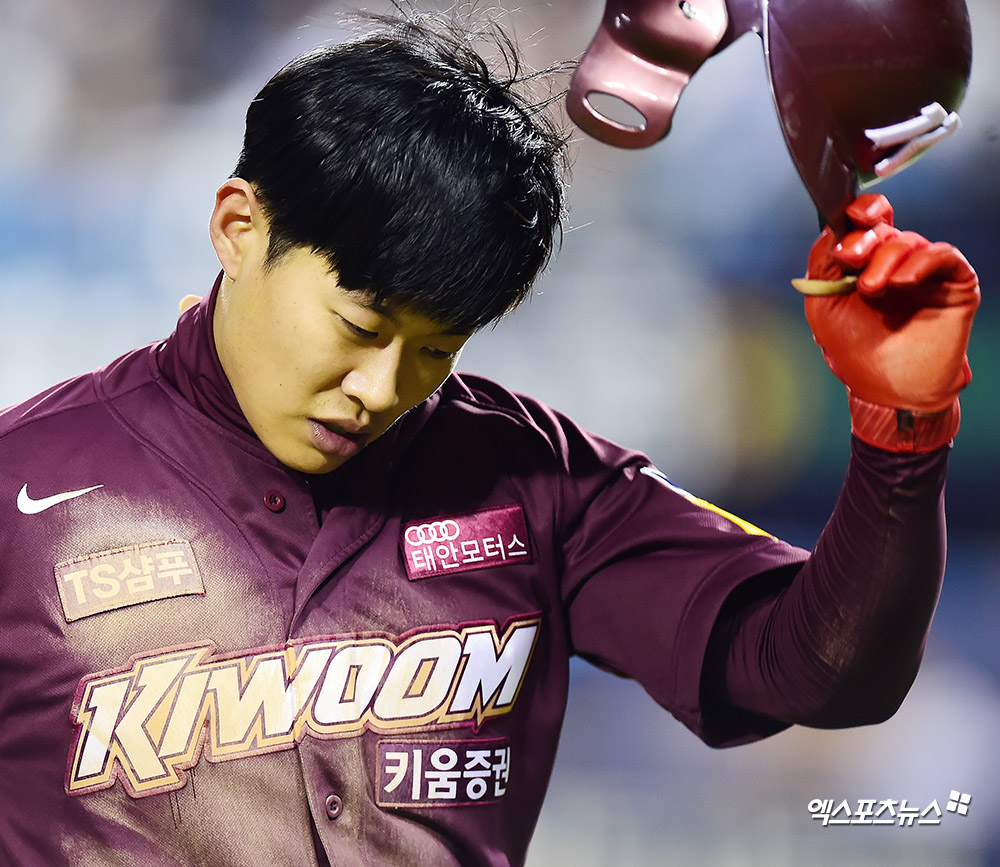 8회초 무사 1루 키움 송성문이 번트를 시도했지만 병살타 아웃된 후 더그아웃으로 향하고 있다.