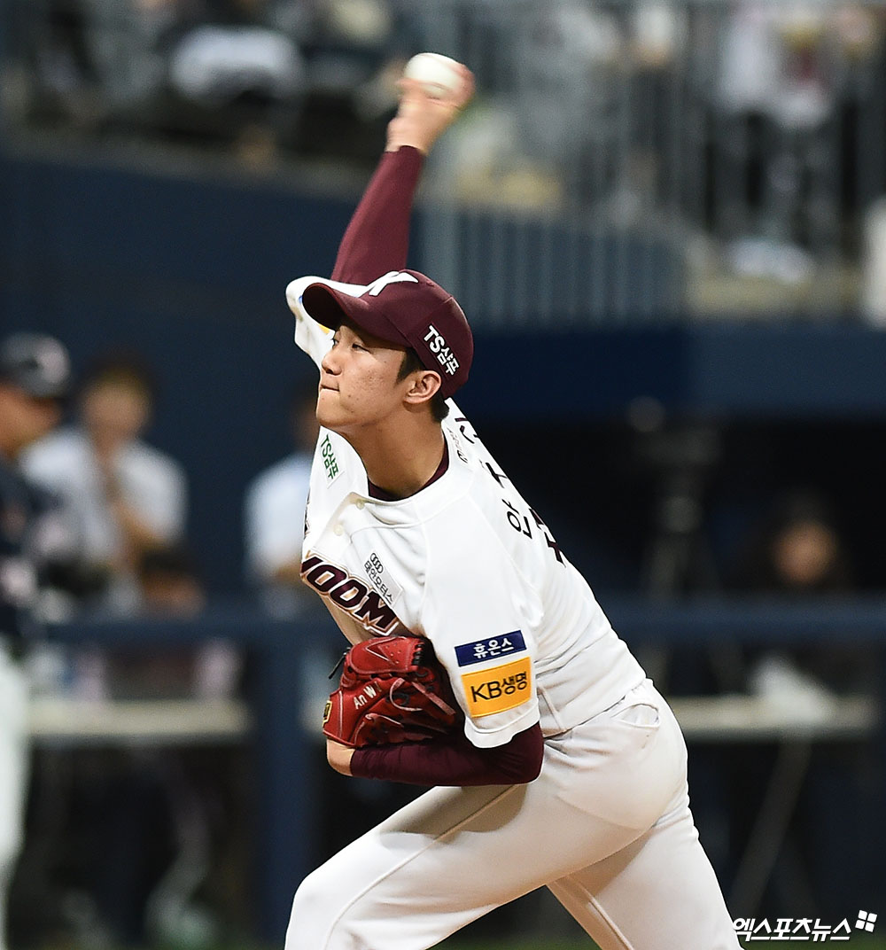 [엑스포츠뉴스 고척, 박지영 기자] 25일 오후 서울 구로구 고척스카이돔에서 열린 '2019 신한은행 MY CAR KBO 포스트시즌' 두산 베어스와 키움 히어로즈와 한국시리즈 3차전 경기, 5회초 무사 1루 키움 안우진이 역투하고 있다.