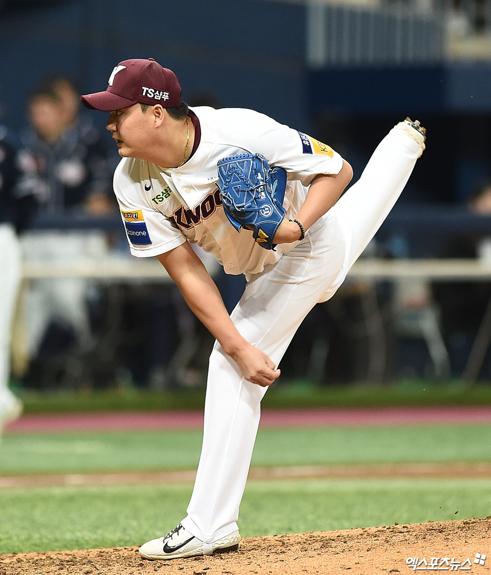 [엑스포츠뉴스 고척, 박지영 기자] 25일 오후 서울 구로구 고척스카이돔에서 열린 '2019 신한은행 MY CAR KBO 포스트시즌' 두산 베어스와 키움 히어로즈와 한국시리즈 3차전 경기, 6회초 2사 2루 키움 김동준이 역투하고 있다.