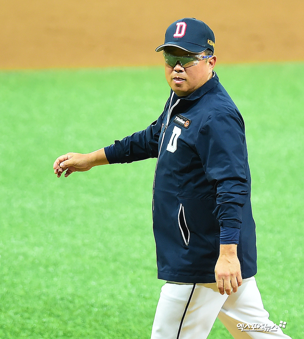 [엑스포츠뉴스 고척, 김한준 기자] 25일 오후 서울 구로구 고척스카이돔에서 열린 '2019 신한은행 MY CAR KBO 포스트시즌' 두산 베어스와 키움 히어로즈의 한국시리즈 3차전 경기, 7회말 무사 1루 두산 김태형 감독이 마운드를 방문한 후 더그아웃으로 향하고 있다.