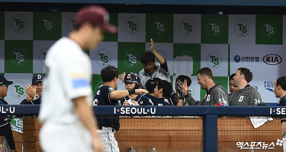 [엑스포츠뉴스 고척, 박지영 기자] 26일 오후 서울 구로구 고척스카이돔에서 열린 '2019 신한은행 MY CAR KBO 포스트시즌' 두산 베어스와 키움 히어로즈와 한국시리즈 4차전 경기, 2회초 2사 2루 두산 허경민의 적시타 때 2루주자 박세혁이 득점을 올린 뒤 더그아웃에서 동료들과 하이파이브를 나누고 있다.