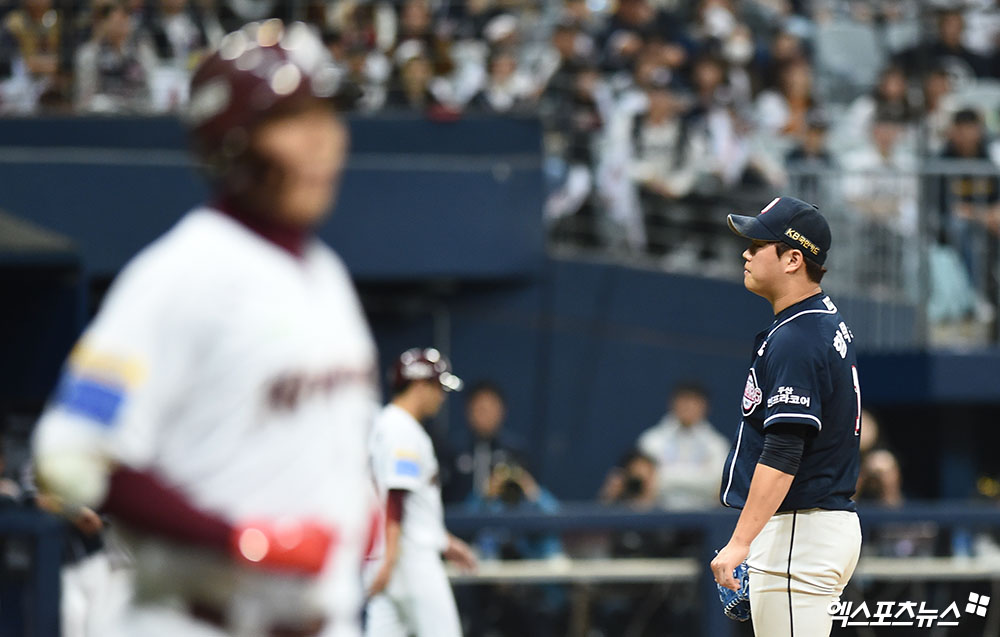 [엑스포츠뉴스 고척, 박지영 기자] 26일 오후 서울 구로구 고척스카이돔에서 열린 '2019 신한은행 MY CAR KBO 포스트시즌' 두산 베어스와 키움 히어로즈와 한국시리즈 4차전 경기, 2회말 2사 만루 두산 함덕주가 키움 송성문에게 밀어내기 볼넷을 허용하며 아쉬워하고 있다.