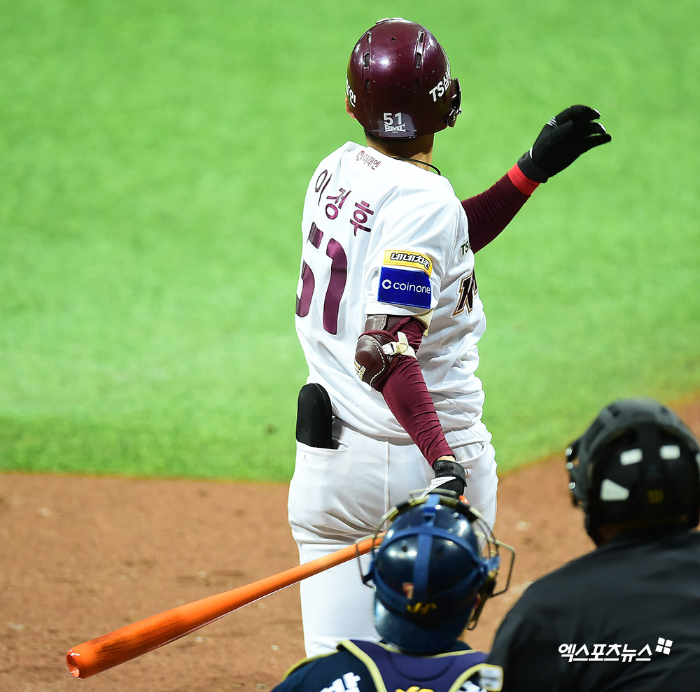 [엑스포츠뉴스 고척, 김한준 기자] 26일 오후 서울 구로구 고척스카이돔에서 열린 '2019 신한은행 MY CAR KBO 포스트시즌' 두산 베어스와 키움 히어로즈의 한국시리즈 4차전 경기, 3회말 2사 1루 키움 이정후가 우전안타를 날리고 있다.