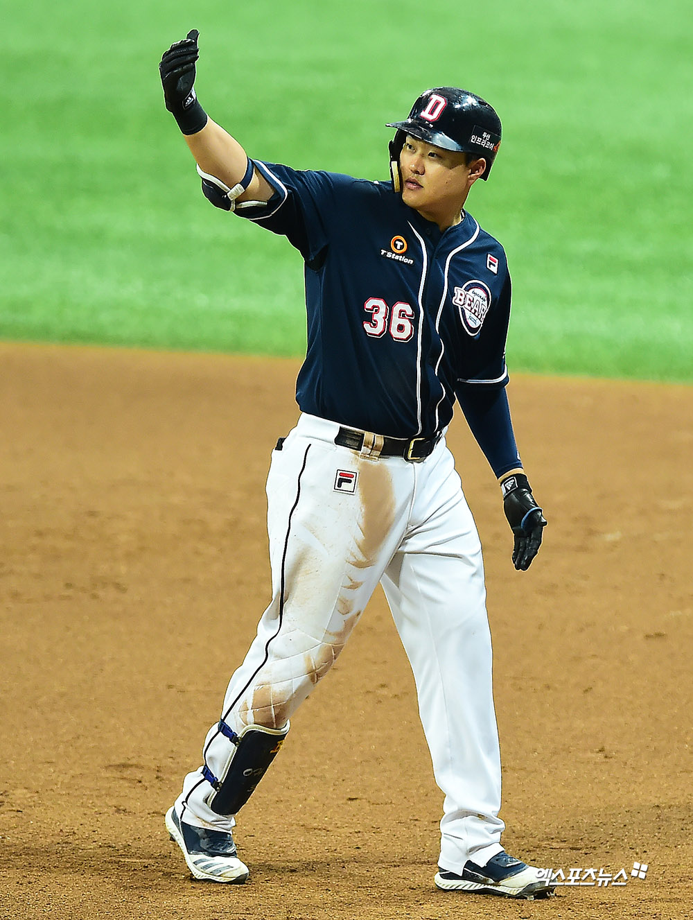 [엑스포츠뉴스 고척, 김한준 기자] 26일 오후 서울 구로구 고척스카이돔에서 열린 '2019 신한은행 MY CAR KBO 포스트시즌' 두산 베어스와 키움 히어로즈의 한국시리즈 4차전 경기, 5회초 무사 1,3루 두산 오재일이 1타점 적시타를 날린 후 세리머니를 하고 있다.