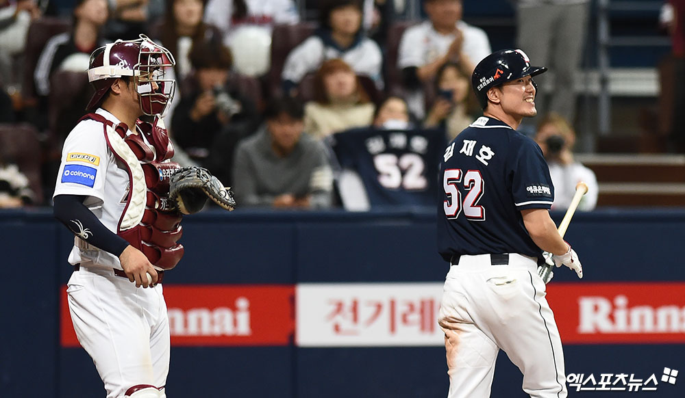 [엑스포츠뉴스 고척, 박지영 기자] 26일 오후 서울 구로구 고척스카이돔에서 열린 '2019 신한은행 MY CAR KBO 포스트시즌' 두산 베어스와 키움 히어로즈와 한국시리즈 4차전 경기, 6회초 1사 만루 두산 김재호가 헛스윙 삼진 아웃으로 물러나며 아쉬워하고 있다.