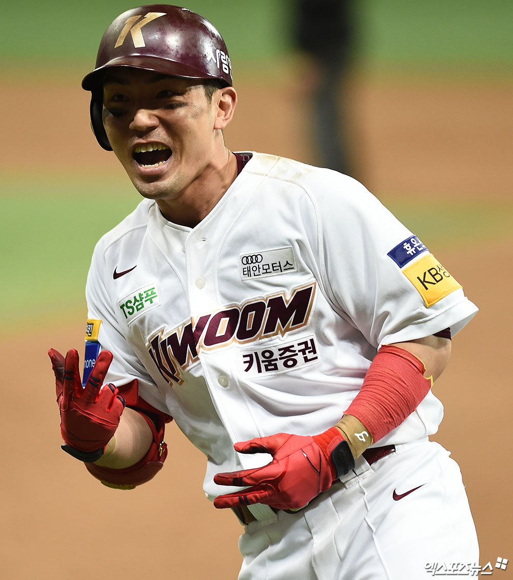 [엑스포츠뉴스 고척, 박지영 기자] 26일 오후 서울 구로구 고척스카이돔에서 열린 '2019 신한은행 MY CAR KBO 포스트시즌' 두산 베어스와 키움 히어로즈와 한국시리즈 4차전 경기, 9회말 2사 만루 키움 서건창이 두산 3루수 허경민의 실책으로 출루한 뒤 환호하고 있다.