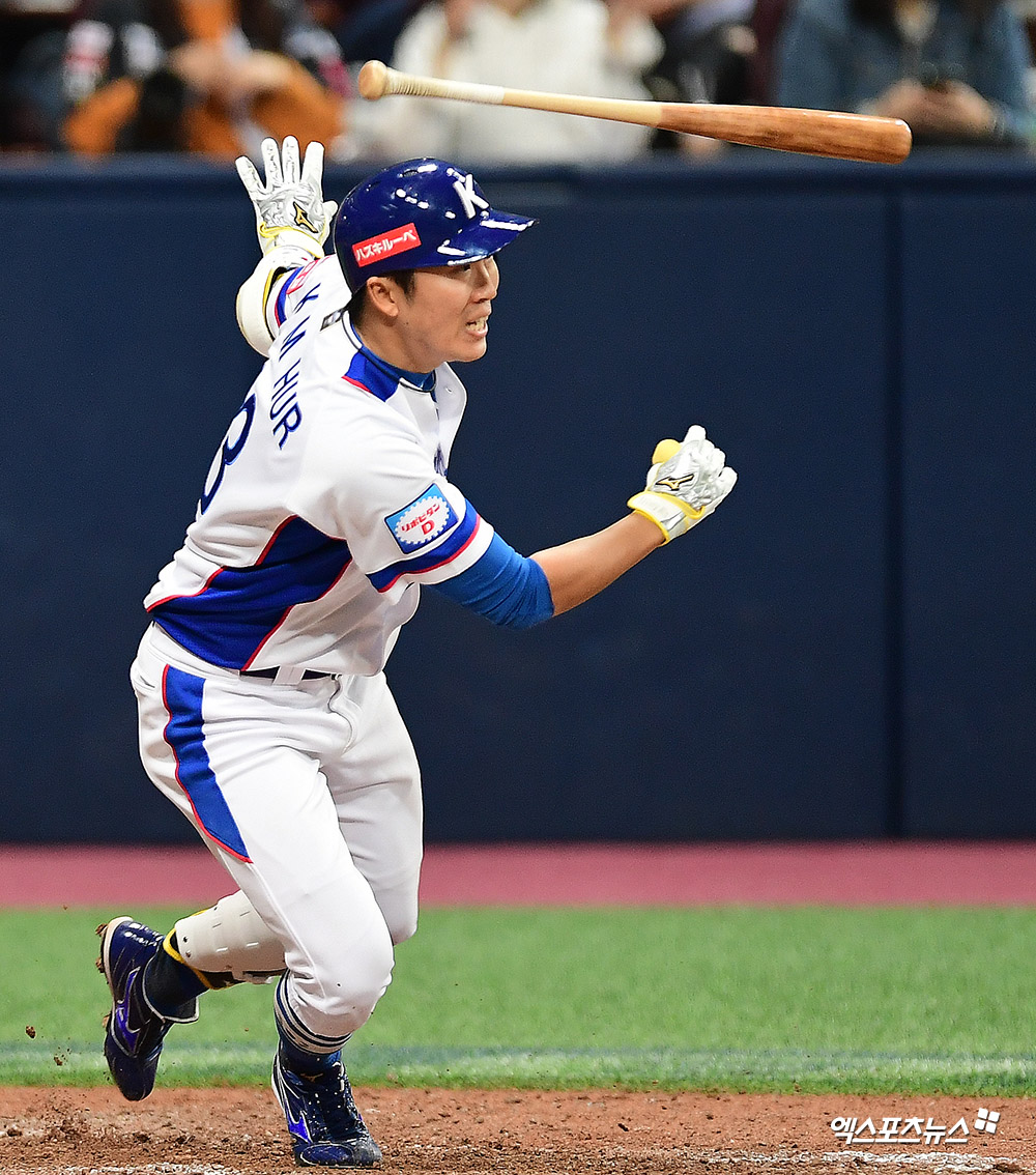 [엑스포츠뉴스 고척, 김한준 기자] 6일 오후 서울 구로구 고척스카이돔에서 열린 '2019 WBSC 프리미어12' 서울 예선라운드 호주와 대한민국의 경기, 6회말 2사 1,2루 대한민국 허경민이 1타점 적시타를 날리고 있다.