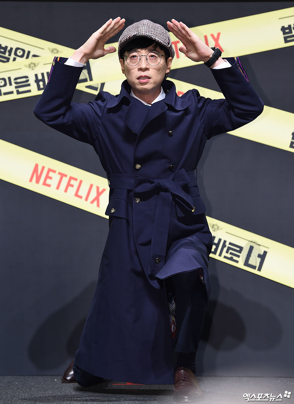 [엑스포츠뉴스 박지영 기자] 8일 오전 서울 신사동 CGV 압구정점에서 열린 넷플릭스 오리지널 시리즈 '범인은 바로 너!' 시즌 2 제작발표회에 참석한 방송인 유재석이 포토타임을 갖고 있다.