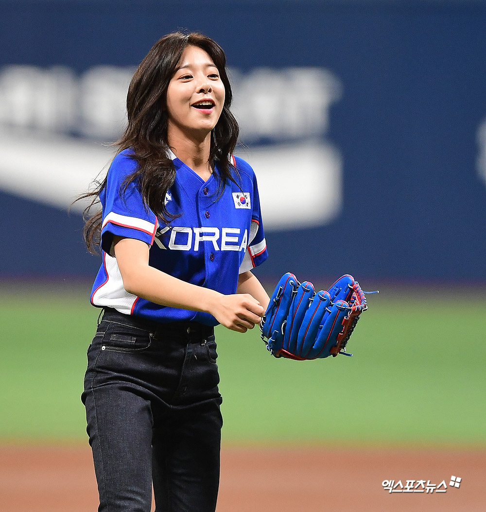 [엑스포츠뉴스 고척, 김한준 기자] 8일 오후 서울 구로구 고척스카이돔에서 열린 '2019 WBSC 프리미어12' 서울 예선라운드 쿠바와 대한민국의 경기, 경기 전 배우 설인아가 시구에 임하고 있다.