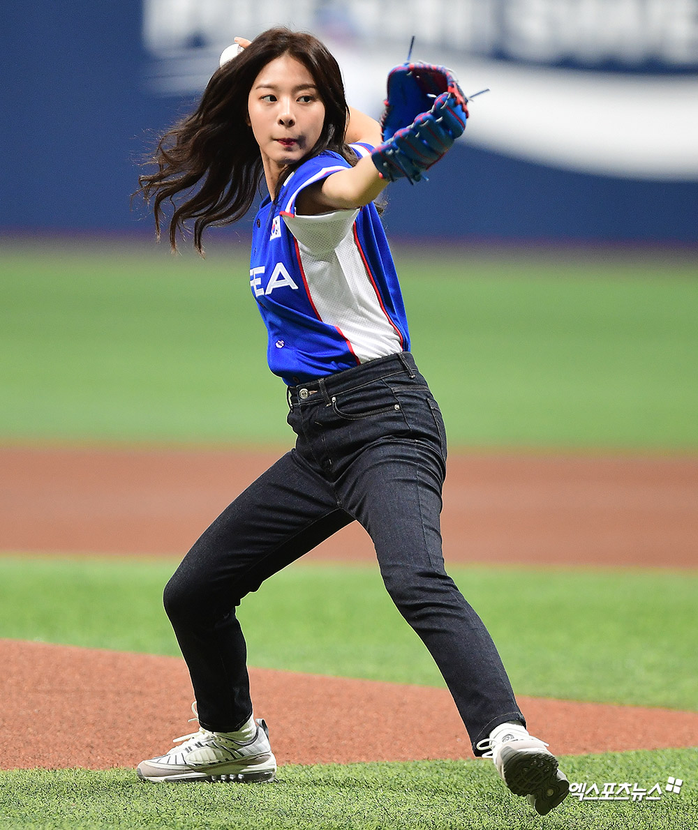 [엑스포츠뉴스 고척, 김한준 기자] 8일 오후 서울 구로구 고척스카이돔에서 열린 '2019 WBSC 프리미어12' 서울 예선라운드 쿠바와 대한민국의 경기, 경기 전 배우 설인아가 시구에 임하고 있다.