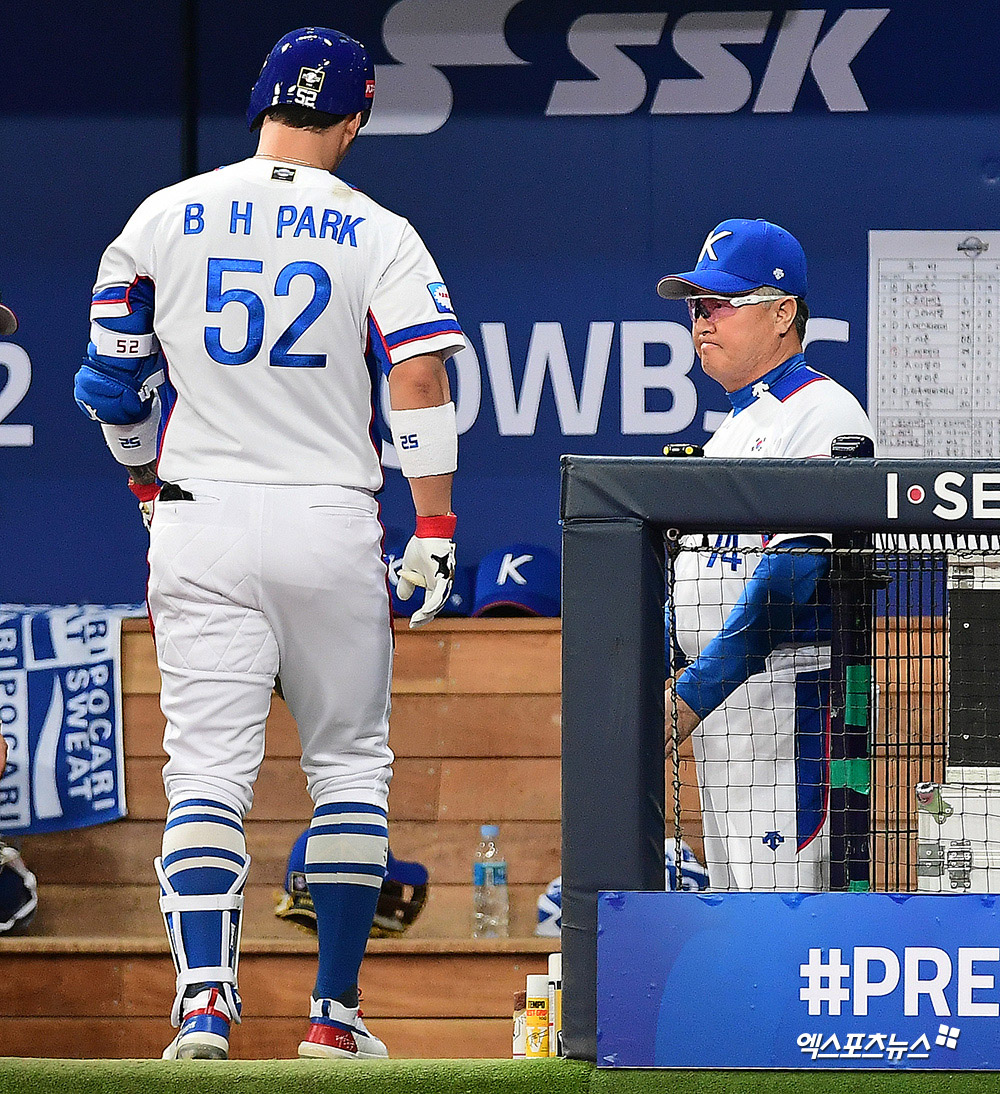 [엑스포츠뉴스 고척, 김한준 기자] 8일 오후 서울 구로구 고척스카이돔에서 열린 '2019 WBSC 프리미어12' 서울 예선라운드 쿠바와 대한민국의 경기, 1회말 1사 1,2루 대한민국 김경문 감독이 1루수 파울플라이로 아웃된 박병호를 격려하고 있다.