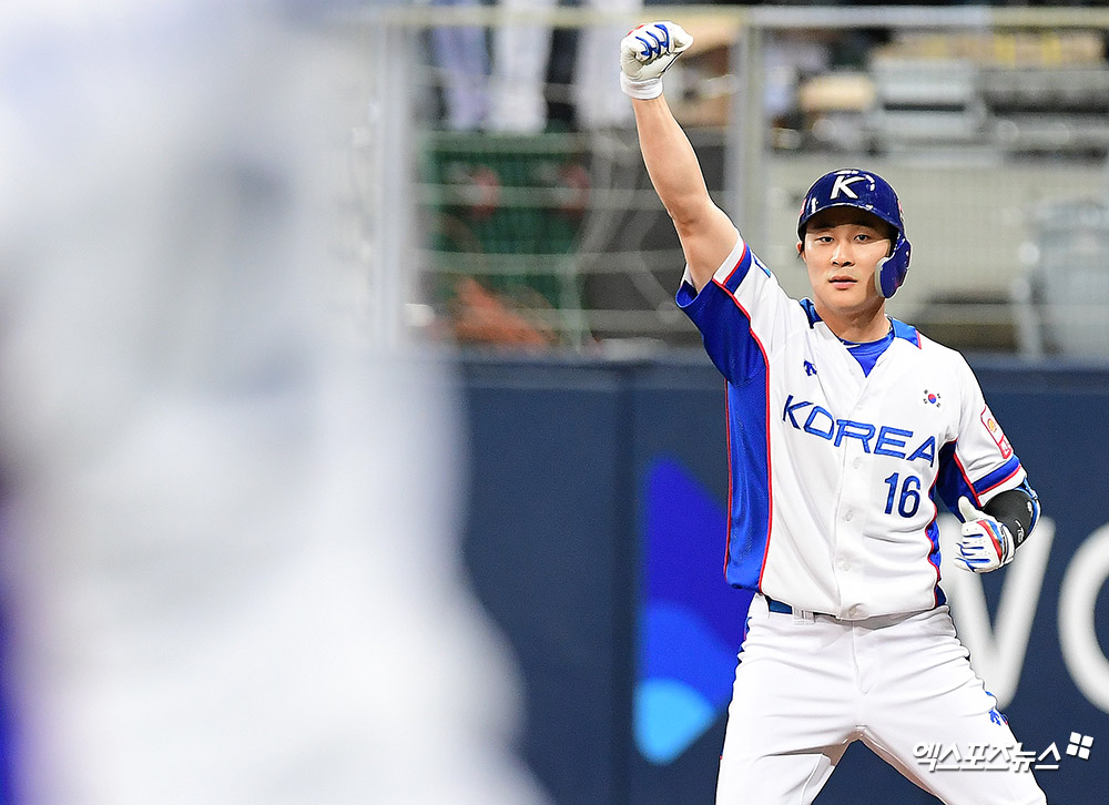 [엑스포츠뉴스 고척, 김한준 기자] 8일 오후 서울 구로구 고척스카이돔에서 열린 '2019 WBSC 프리미어12' 서울 예선라운드 쿠바와 대한민국의 경기, 2회말 2사 만루 대한민국 김하성이 2타점 적시타를 날린 후 기뻐하고 있다.
