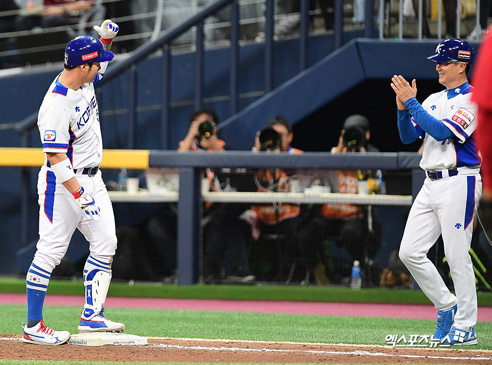 [엑스포츠뉴스 고척, 김한준 기자] 8일 오후 서울 구로구 고척스카이돔에서 열린 '2019 WBSC 프리미어12' 서울 예선라운드 쿠바와 대한민국의 경기, 5회말 1사 1,2루 대한민국 박병호가 중전안타를 날린 후 세리머니를 하고 있다.