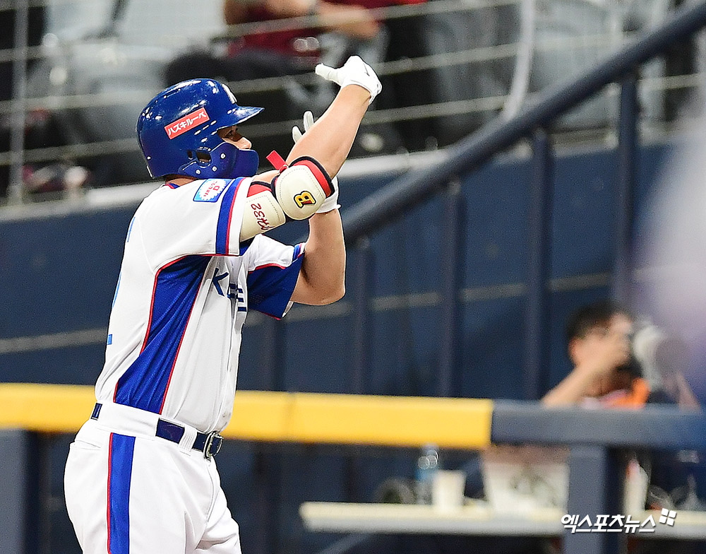 [엑스포츠뉴스 고척, 김한준 기자] 8일 오후 서울 구로구 고척스카이돔에서 열린 '2019 WBSC 프리미어12' 서울 예선라운드 쿠바와 대한민국의 경기, 5회말 1사 만루 대한민국 김재환이 2타점 적시타를 날린 후 세리머니를 하고 있다.