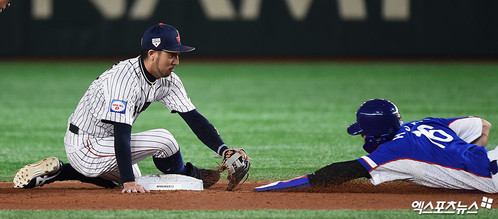 [엑스포츠뉴스 도쿄(일본), 박지영 기자] 17일 오후 일본 도쿄돔에서 열린 '2019 WBSC 프리미어 12' 결승전 대한민국과 일본의 경기, 3회초 무사 1루 대한민국 김재환의 좌익수 플라이 때 1루주자 김하성이 2루로 태그업을 시도하고 있다. 결과는 아웃.