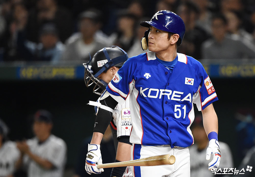 [엑스포츠뉴스 도쿄(일본), 박지영 기자] 17일 오후 일본 도쿄돔에서 열린 '2019 WBSC 프리미어 12' 결승전 대한민국과 일본의 경기, 8회초 무사 대한민국 선두타자 이정후가 헛스윙 삼진으로 물러나며 아쉬워하고 있다.