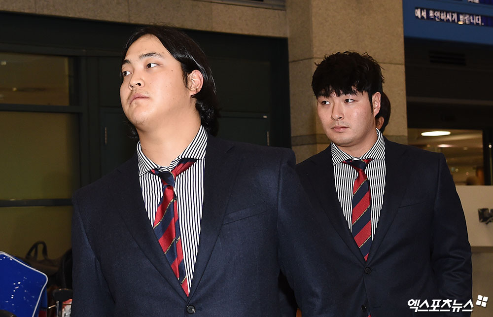 [엑스포츠뉴스 인천공항, 박지영 기자] '2019 WBSC 프리미어 12'에서 준우승을 차지한 대한민국 야구 대표팀이 18일 오후 인천국제공항을 통해 귀국했다. 조상우, 박병호가 입국장을 빠져나오고 있다.