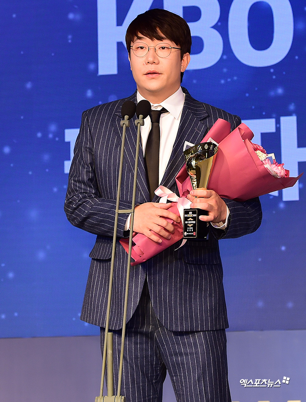 [엑스포츠뉴스 김한준 기자] 25일 오후 서울 삼성동 인터컨티넨탈 서울 코엑스 하모니볼룸에서 열린 '2019 신한은행 MY CAR KBO 시상식'에서 KBO리그 평균자책점상을 수상한 KIA 양현종이 소감을 말하고 있다.