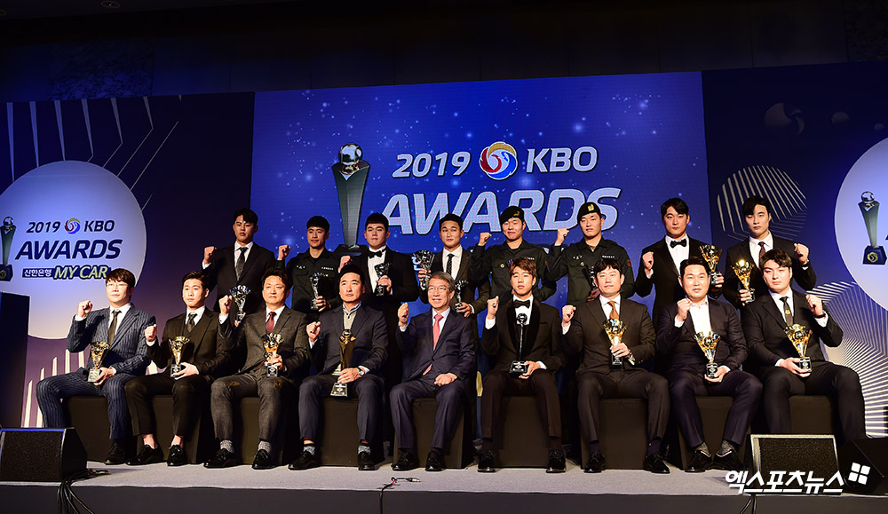[엑스포츠뉴스 김한준 기자] 25일 오후 서울 삼성동 인터컨티넨탈 서울 코엑스 하모니볼룸에서 열린 '2019 신한은행 MY CAR KBO 시상식'에 참석한 각 수상자들이 기념촬영을 갖고 있다.