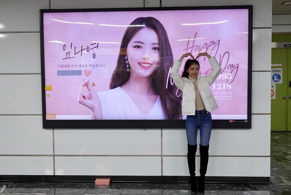 사진 속 임나영은 흰색 패딩에 청바지, 검은 부츠를 입고 자신의 생일 축하 전광판 앞에서 머리 위로 하트를 그리고 있다.