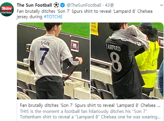 23일(이하 한국시간) 영국 매체 더선은 앞서 같은 날 열린 2019/20 잉글리시 프리미어리그(EPL) 토트넘과 첼시의 경기 도중 손흥민이 새겨진 토트넘 유니폼을 입고 있던 팬이, 첼시 유니폼으로 바꿔 입는 모습을 전했다.