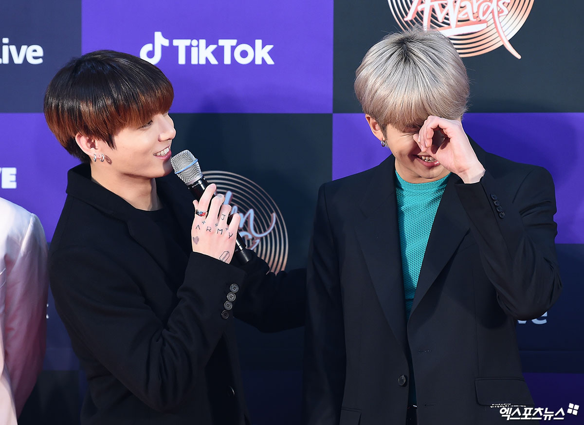 [엑스포츠뉴스 박지영 기자] 5일 오후 서울 구로구 고척스카이돔에서 열린 '제34회 골든디스크어워즈 with 틱톡' 음반 부문 시상식에 앞서 진행된 레드카펫 행사에 참석한 그룹 방탄소년단 정국, RM이 포토타임을 갖고 있다.