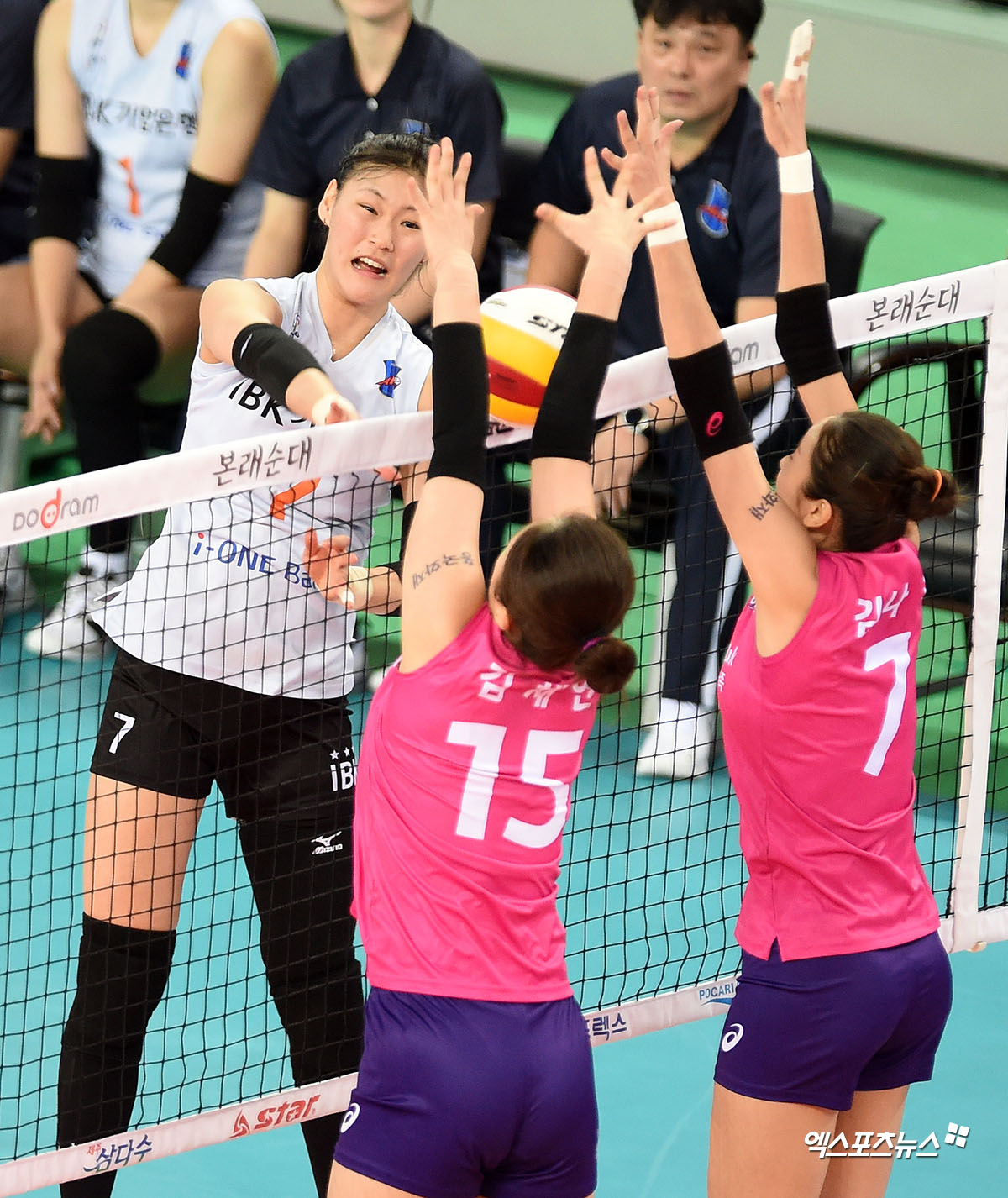 [엑스포츠뉴스 계양, 김한준 기자] 14일 오후 인천 계양체육관에서 열린 '도드람 2019-2020 V리그' 여자부 흥국생명과 IBK기업은행의 경기, 기업은행 김주향이 공격을 시도하고 있다.