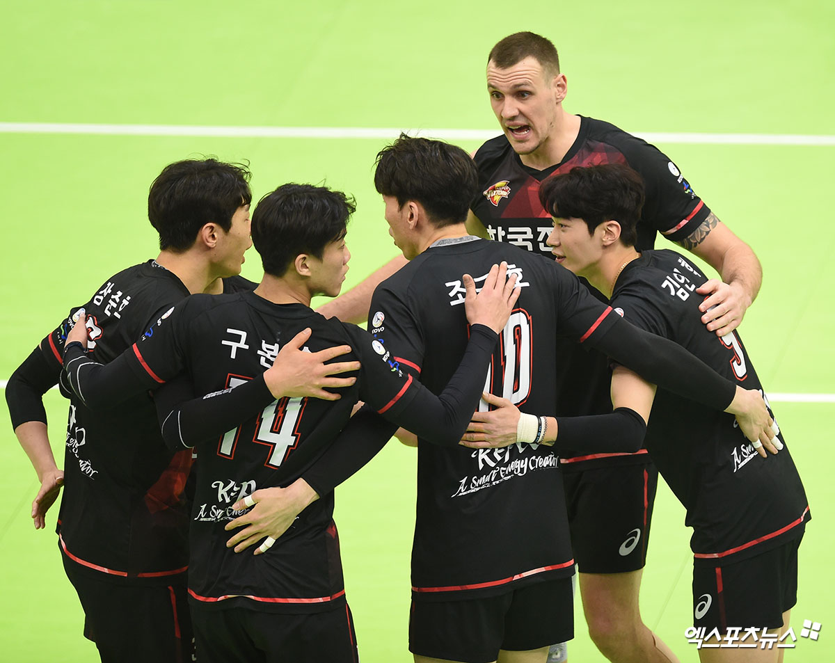 [엑스포츠뉴스 수원, 김한준 기자] 17일 오후 경기도 수원실내체육관에서에서 열린 '도드람 2019-2020 V리그' 남자부 한국전력과 삼성화재의 경기, 한국전력 선수들이 득점에 성공한 후 기뻐하고 있다.