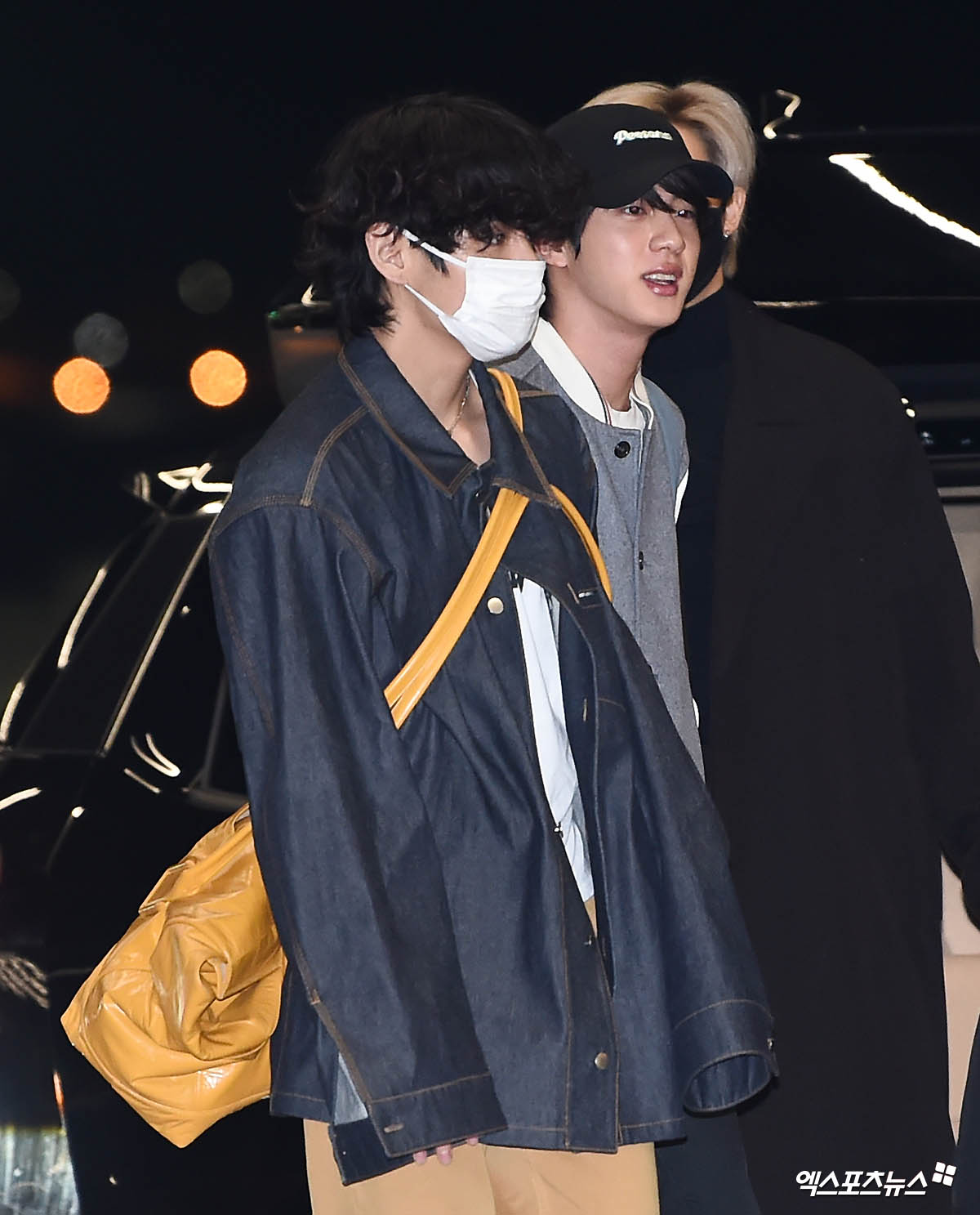 [엑스포츠뉴스 인천공항, 윤다희 기자] 그룹 방탄소년단(BTS) 뷔, 진이 해외 일정차 18일 오후 인천국제공항을 통해 미국 로스앤젤레스로 출국하고 있다.
