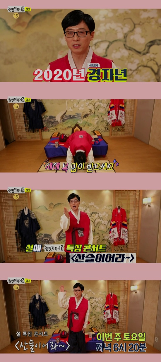 설 당일인 25일 오후 6시 20분 시청자를 찾아가는 '설에 놀면 뭐하니?-산슬이어라'는 '놀면 뭐하니?-뽕포유'가 키운 트로트 영재 유산슬의 '1집 굿바이 콘서트-인연' 실황과 방송에서 미처 공개하지 못했던 비하인드 장면으로 꾸며진다.