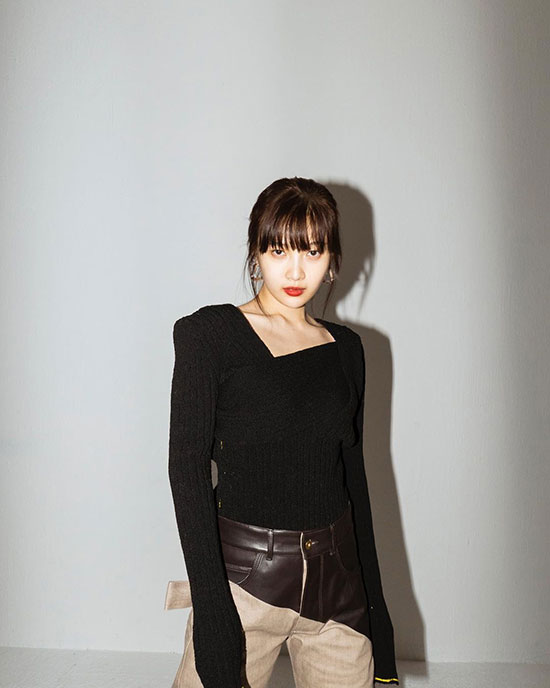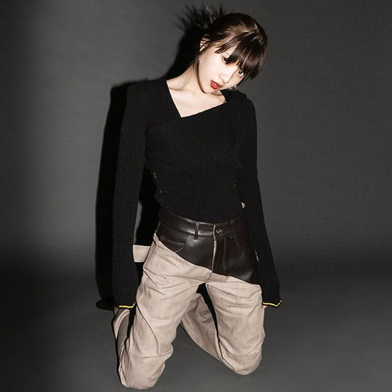 사진 속 조이는 사선으로 가죽 부분이 매치된 브라운-베이지 톤 팬츠에 검정색 니트를 매치했다.