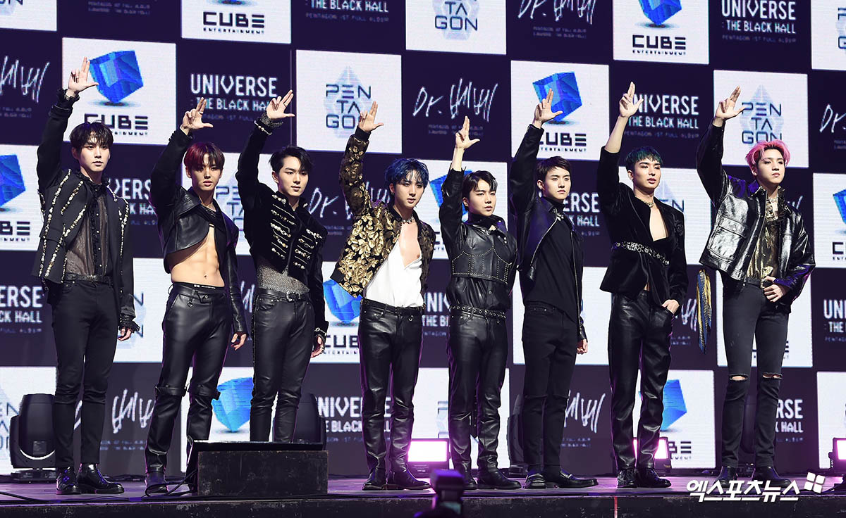[엑스포츠뉴스 윤다희 기자] 12일 오후 서울 광장동 예스24라이브홀에서 열린 그룹 펜타곤(PENTAGON) 첫 번째 정규앨범 ‘UNIVERSE : THE BLACK HALL(유니버스 : 더 블랙 홀)’ 발매 기념 쇼케이스에 참석한 펜타곤이 포토타임을 갖고 있다.