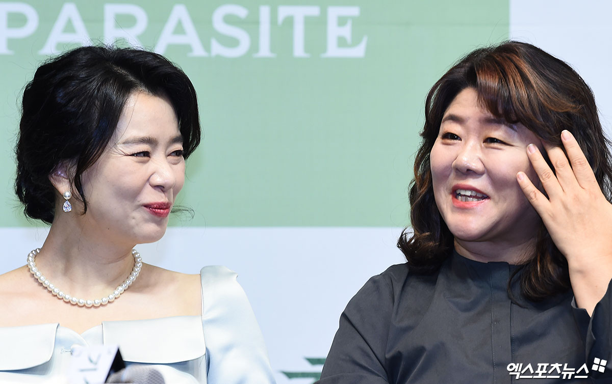 [엑스포츠뉴스 박지영 기자] 19일 오전 서울 소공동 웨스틴 조선 호텔 그랜드볼룸에서 열린 영화 '기생충' 아카데미 수상 기념 기자회견에 참석한 배우 장혜진, 이정은이 이야기를 나누고 있다.