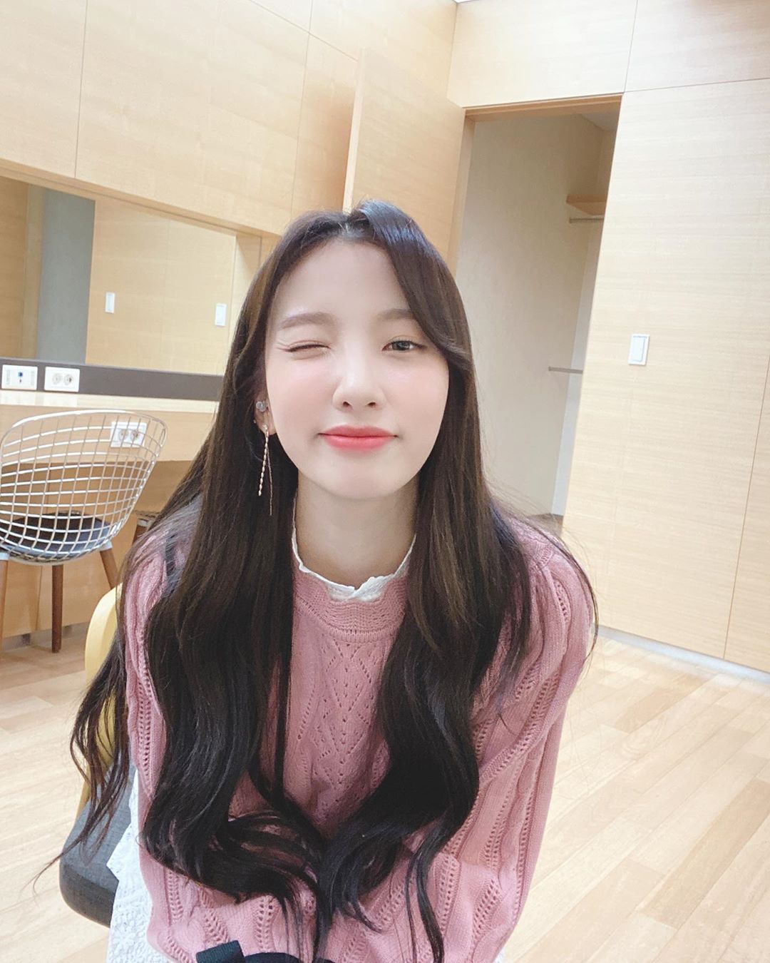 사진 속 지숙은 핑크색 니트를 입은 채 의자에 앉아있는 모습이다. 지숙은 입술을 내미는 포즈는 물론, 윙크를 하면서 다양한 매력을 자랑했다.