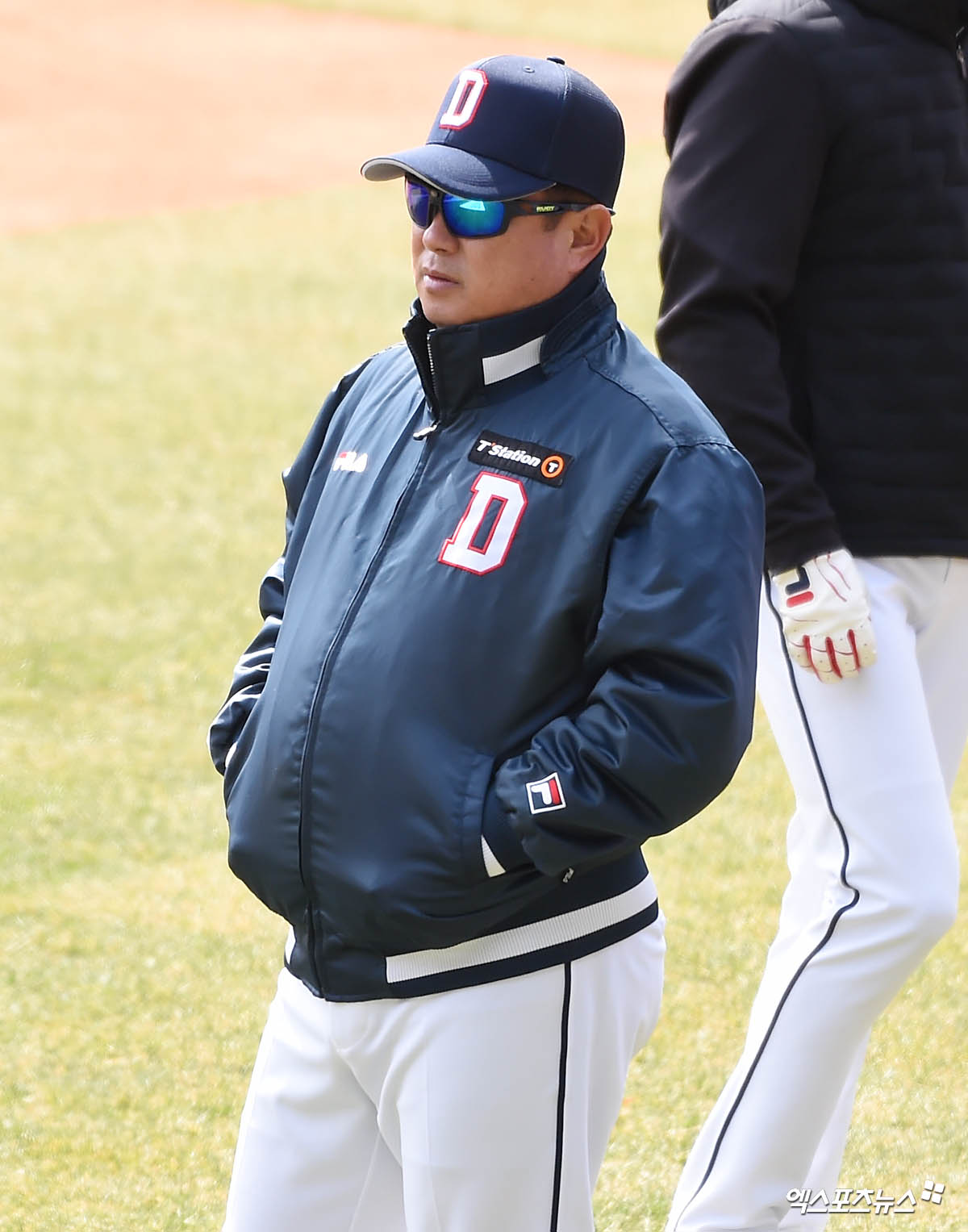 두산 김태형 감독이 훈련을 지켜보고 있다.
