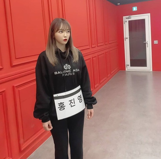 공개된 사진 속 홍진영은 어딘가를 응시하는 모습이다. 이름이 적힌 종이를 몸에 붙인 채 서 있는 홍진영의 인형 같은 비주얼이 시선을 사로잡는다.