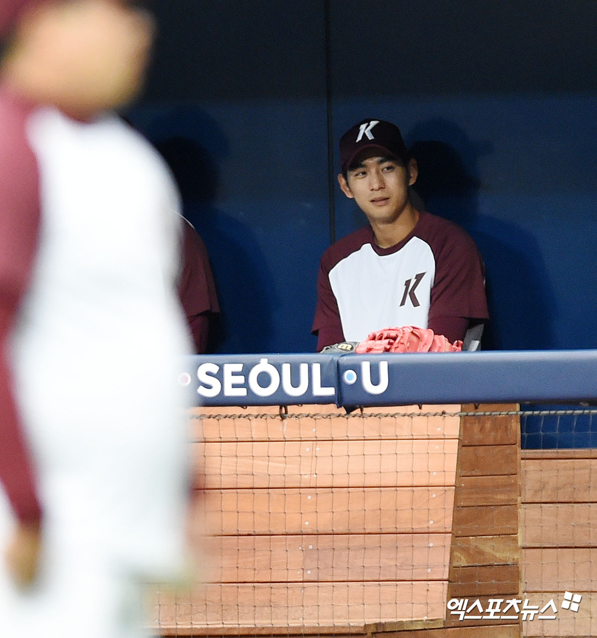 키움 이정후가 더그아웃에서 선수들의 훈련을 지켜보고 있다.