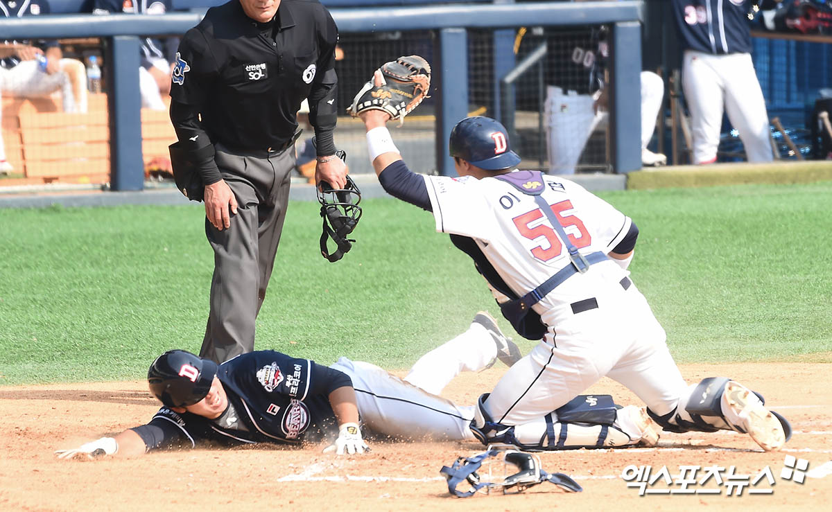 [엑스포츠뉴스 잠실, 윤다희 기자] 25일 오후 서울 송파구 잠실야구장에서 진행된 두산 베어스 자체 청백전 경기, 3회초 1사 1,3루 최주환의 우익수 플라이 때 백팀 이흥련이 홈으로 쇄도하는 청팀 허경민을 태그아웃 처리하고 있다.