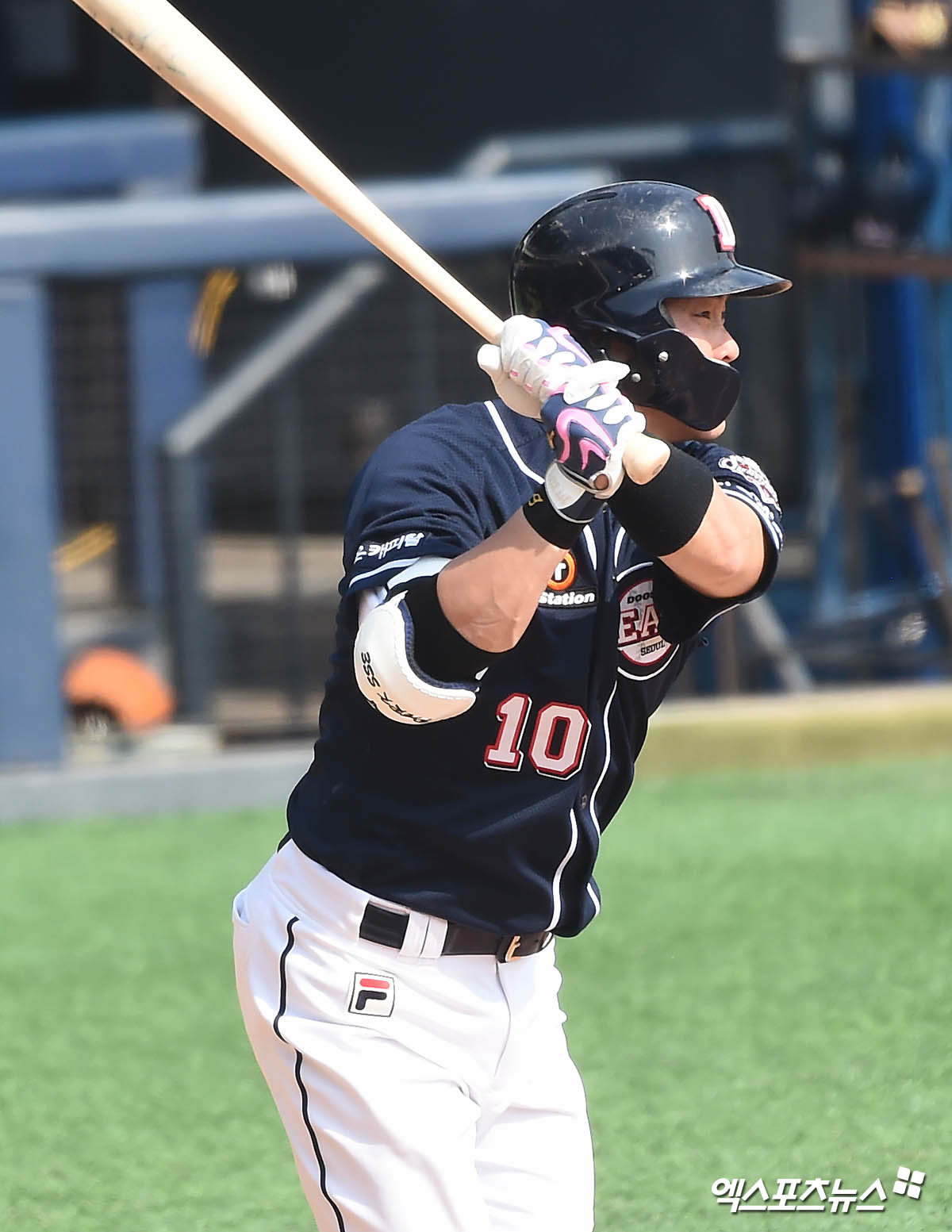 [엑스포츠뉴스 잠실, 윤다희 기자] 25일 오후 서울 송파구 잠실야구장에서 진행된 두산 베어스 자체 청백전 경기, 4회초 청팀 박세혁이 안타를 날리고 있다.